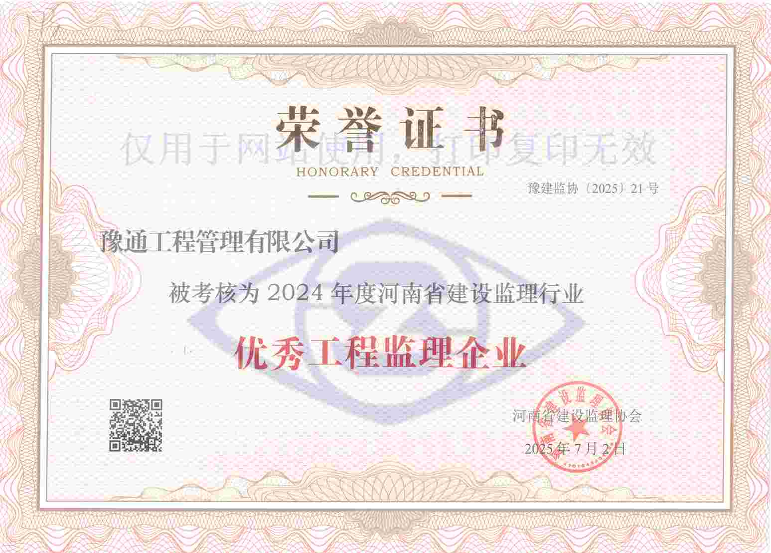 近日,河南省建設(shè)監(jiān)理協(xié)會(huì)發(fā)布了《關(guān)于公布2024年度會(huì)員單位和從業(yè)人員考核結(jié)果的通知》,我公司榮獲“2024年度優(yōu)秀工程監(jiān)理企業(yè)”稱號(hào)。